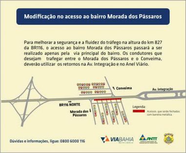 A Prefeitura de Vitória da Conquista, por meio da Secretaria de Mobilidade Urbana (Semob), recebeu o comunicado da Empresa VIABAHIA Concessionária de Rodovias S/A, controladora da Rio-Bahia, que neste sábado (06), em parceria com a Agência Nacional de Transportes Terrestres (ANTT) e a Polícia Rodoviária Federal (PRF), fará o ordenamento do tráfego de veículos que acessam o bairro Morada dos Pássaros. O objetivo é garantir a segurança viária dos usuários da BR-116