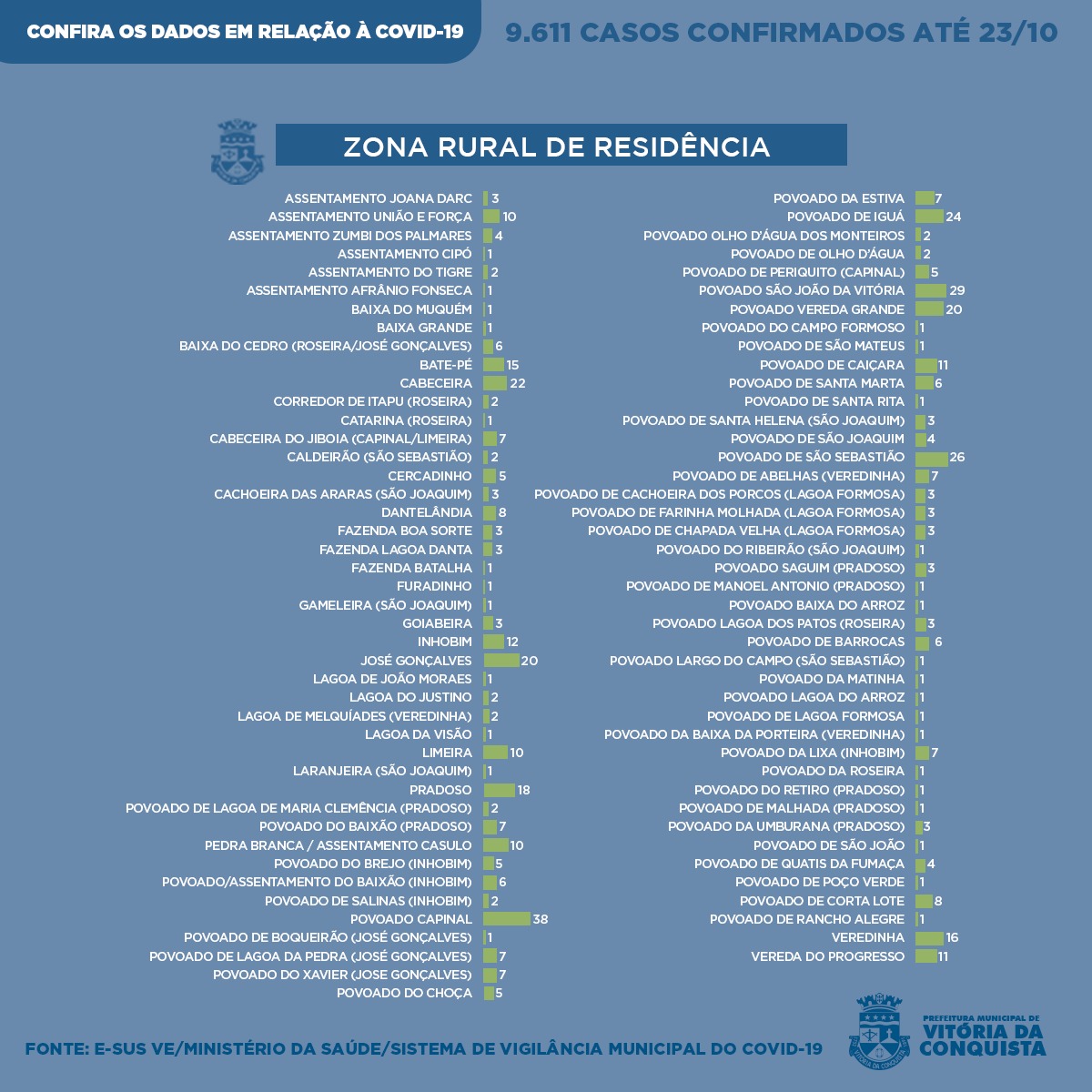 Já na zona rural do município, foram registrados 496 casos, sendo pessoas residentes das localidades de:
