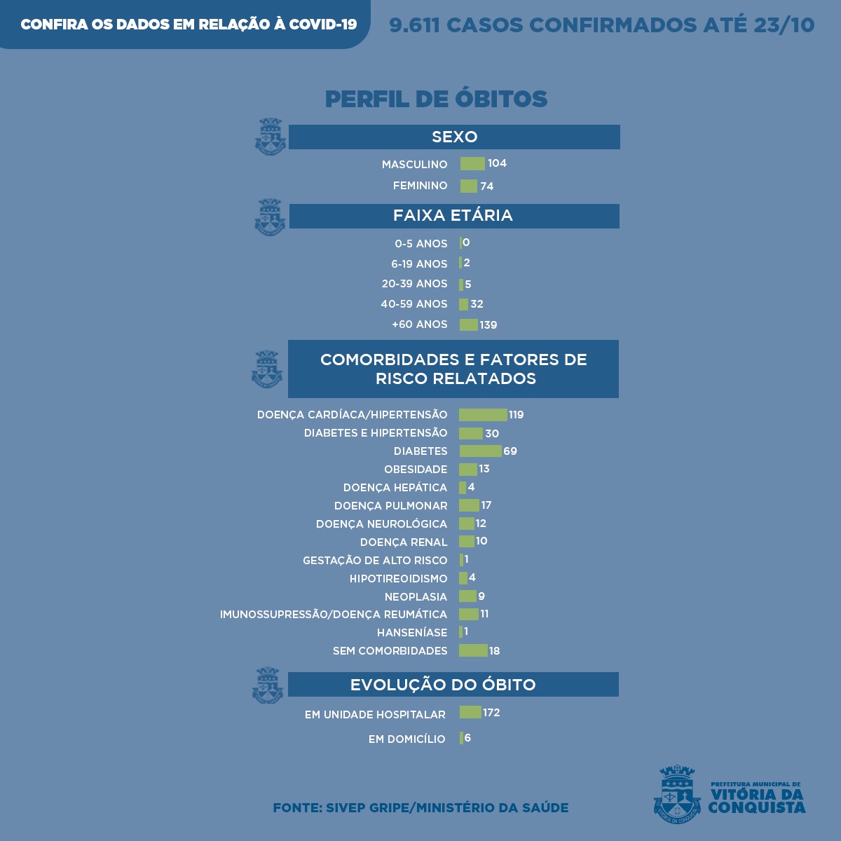 Até o momento, foram registradas 178 mortes de pacientes do município que tiveram complicações causadas pela Covid-19, sendo que 74 eram do sexo feminino; e 104, do sexo masculino. Quanto à idade desses pacientes, 139 possuíam mais de 60 anos; 32 estavam na faixa etária de 40 a 59 anos; cinco possuíam entre 20 e 39 anos e dois tinham entre seis e 19 anos. Além disso, 172 falecimentos em unidade hospitalar e seis em domicílio.