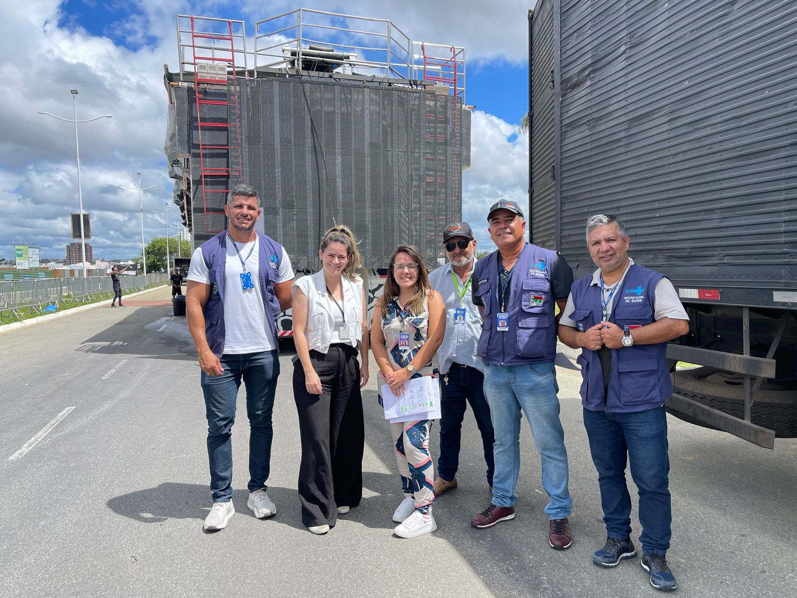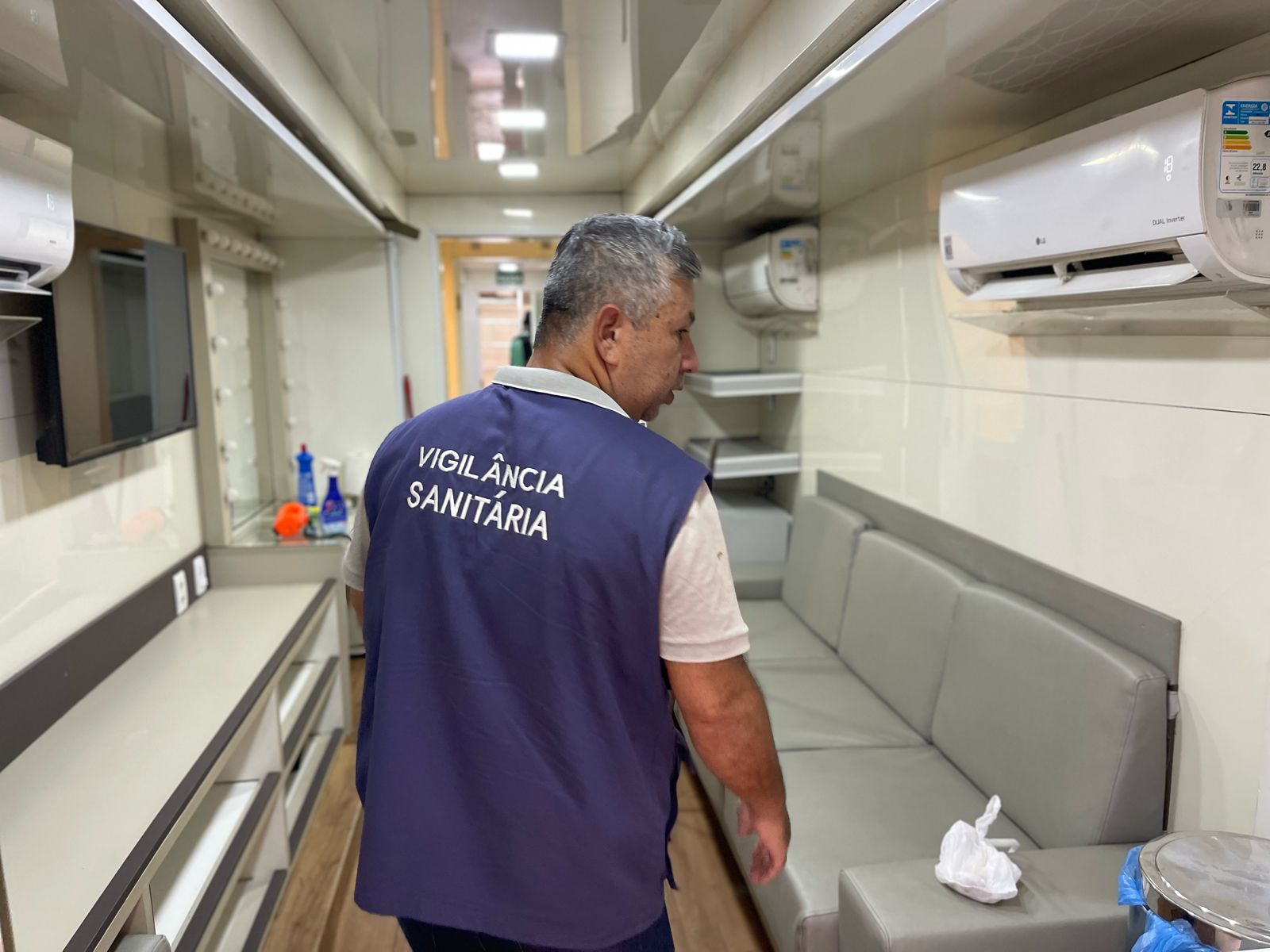 Durante a inspeção, tanto no camarote quanto na área aberta, foram observadas as estruturas interna dos trios e os locais montados onde serão manipulados os alimentos, verificando o cumprimento das normas sanitárias, como a presença de ligamentos de água potável e formas de condicionamento dos produtos.