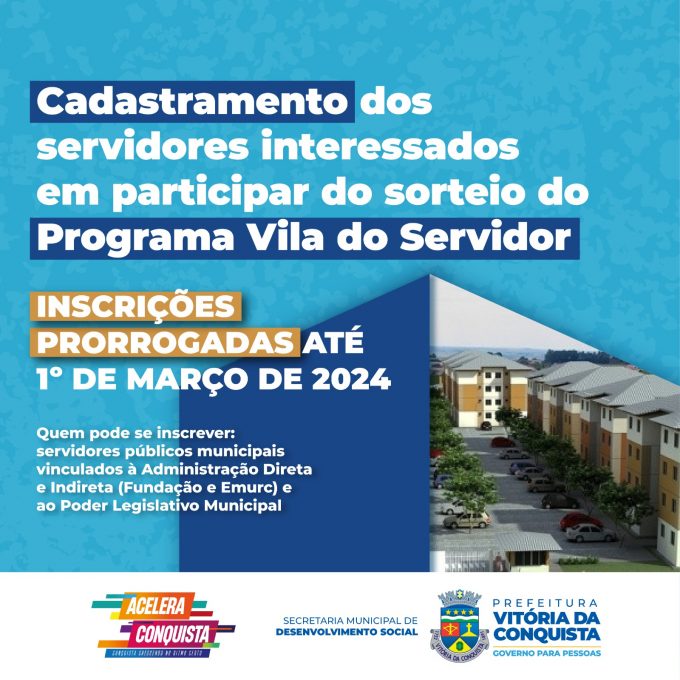 Por meio da Portaria conjunta n° 08/2024 e do edital de convocação 02/2024, publicado nesta sexta-feira (2), no Diário Oficial do Município, a Prefeitura de Vitória da Conquista prorrogou até 1° de março o prazo de inscrição dos servidores no Programa Municipal de Habitação do Servidor Público, popularmente conhecido como Vila do Servidor.