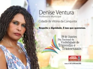 “Apesar dos avanços tanto em nossa cidade quanto nas esferas estaduais e municipais, é fundamental que continuemos, em parceria com o movimento social organizado, a fazer o enfrentamento à transfobia. Nesse sentido, conclamamos a toda população travesti e transexual de Vitória da Conquista que se aproprie do Disque 100 para denunciar qualquer abuso aos seus direitos, bem como violações a sua integridade física e/ou psicológica”, afirma o assessor técnico de Políticas para Diversidade Sexual, Danillo Bitencourt.