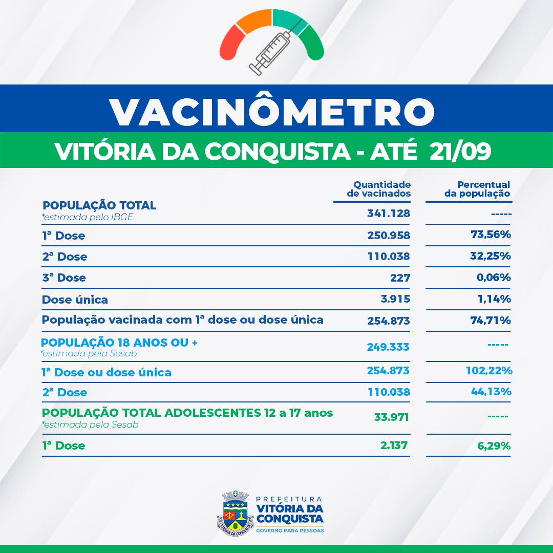 Se considerada apenas a população maior de 18 anos, o percentual é de 102,22%, ultrapassando a estimativa da população de 249.333 habitantes, estabelecida pela Secretaria de Saúde do Estado (Sesab) como critério para distribuição de doses.