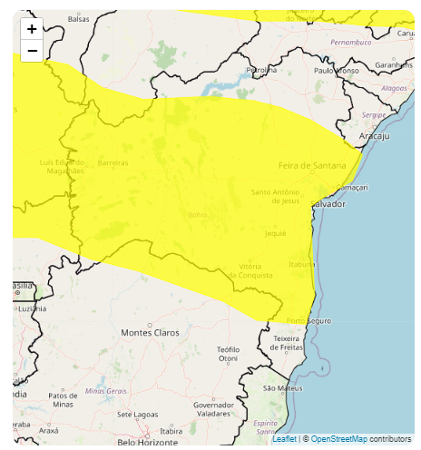 O Instituto Nacional de Meteorologia (Inmet) divulgou, nesta segunda-feira (21), um alerta de chuvas intensas para Vitória da Conquista. A previsão é de chuvas entre 20 mm/ e 30 mm/h, ou 50 mm/dia, com ventos entre 40 e 60 km/h, até às 10h da próxima terça-feira (22).