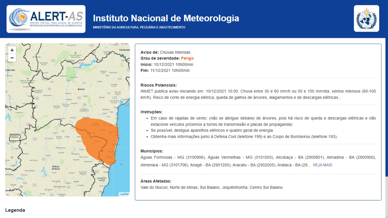 O Instituto Nacional de Meteorologia (Inmet) informa que hoje e amanhã (11) ocorrerão chuvas intensas, entre 30 e 60 milímetros por hora, com rajadas de ventos de 60 a 100 quilômetros por hora, com fortes riscos de cortes de energia, quedas de galhos de árvores, alagamentos e descargas elétricas em Vitória da Conquista.