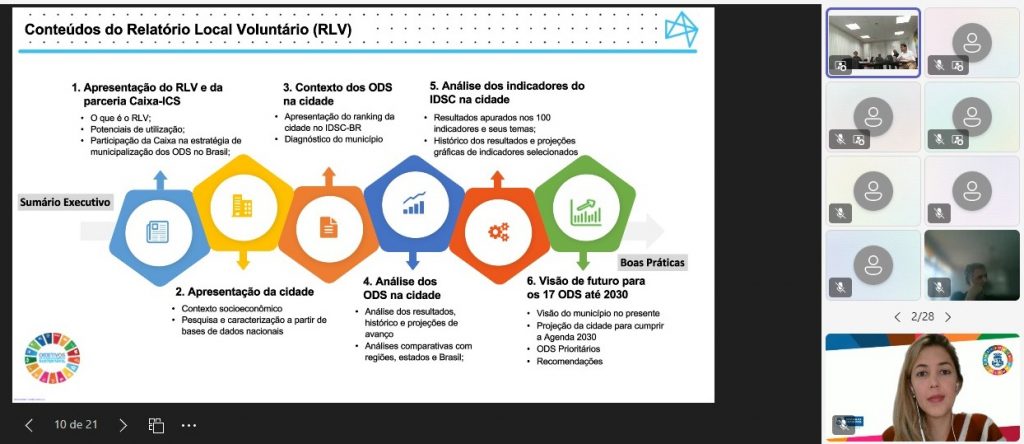 Neste primeiro momento, os representantes dos municípios contemplados com a assessoria foram apresentados à estrutura do Relatório Local Voluntário, como os objetivos e a estrutura, e puderam tirar dúvidas e dividir suas experiências. O evento contou com a participação de representantes do Instituto Cidades Sustentáveis (ICS), do Programa Cidades Sustentáveis (PCS) e da Caixa Econômica Federal.