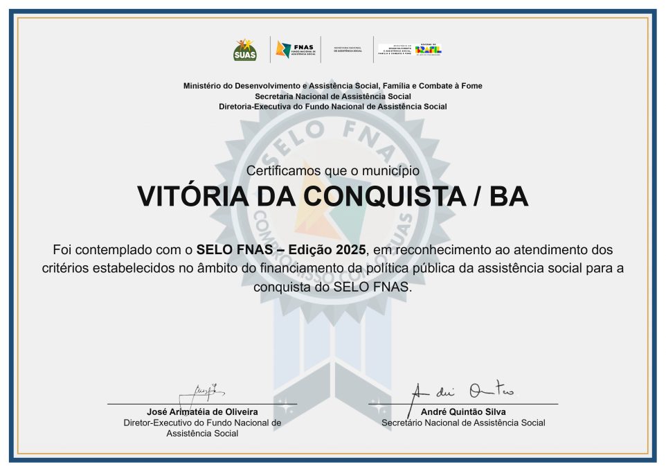 Vitória da Conquista é uma das cidades brasileiras certificadas com o Selo FNAS 2025. A premiação, que reconhece a excelência na execução financeira, orçamentária, contábil e regulatória, bem como a qualidade da política de assistência social (Suas) desenvolvida no município, é concedida pelo Ministério do Desenvolvimento e Assistência Social, Família e Combate à Fome (MDS), do Governo Federal.