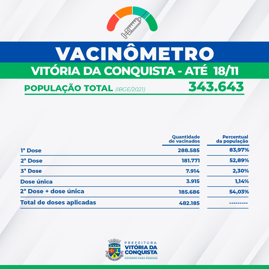 Com a 1ª dose, foram vacinados 288.585 conquistenses, equivalente a 83,97% da população do município, com base na estimativa do IBGE/2021. Das pessoas que já tomaram a 2ª dose ou dose única, o percentual está em 54,03%, com 185.686 vacinados.