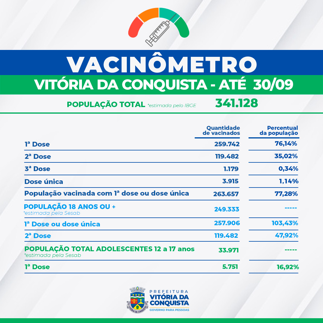 Fazendo o recorte apenas da vacinação dos maiores de 18 anos, a cobertura ultrapassa a estimativa da população de 249.333 habitantes dessa faixa etária, estabelecida pela Secretaria de Saúde do Estado (Sesab) como critério para distribuição de doses e já está em 103,43%, com 257.906 vacinados com 1ª dose ou dose única.
