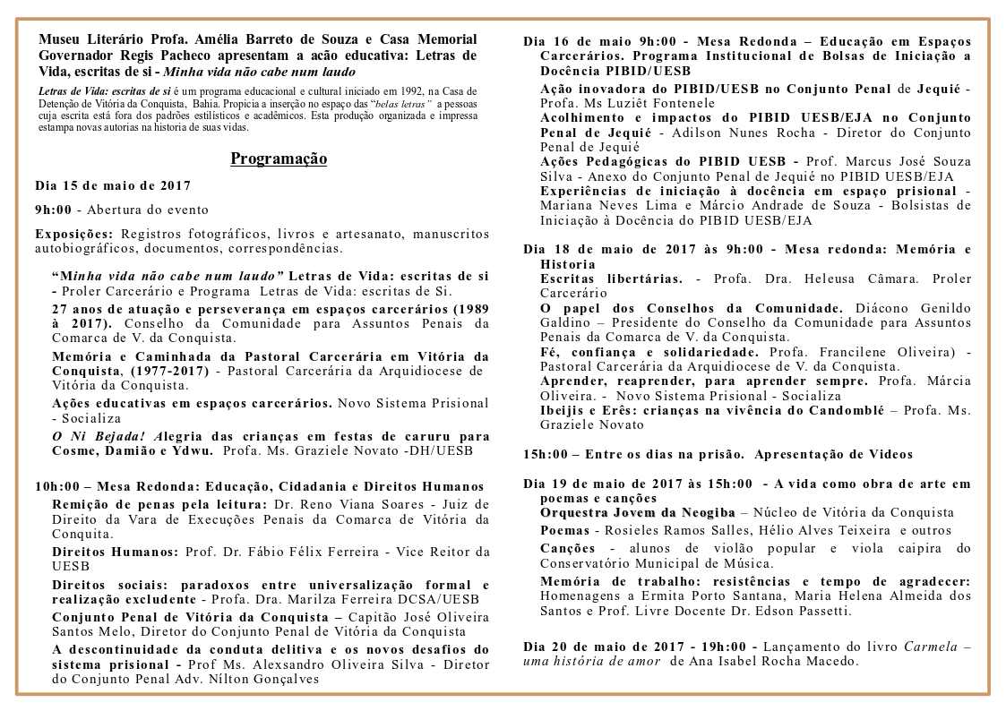 O Letras de Vida é um programa educacional e cultural iniciado em 1992, na Casa de Detenção de Vitória da Conquista, que propicia a inserção de pessoas, no espaço literário, cuja escrita está fora dos padrões estilísticos e acadêmicos. O acervo de originais manuscritos e publicações de livros escritos por pessoas encarceradas e por trabalhadores rurais motivou a exposição e as palestras sobre o direito à escrita, interdição aos discursos, preconceitos linguísticos e remissão de penas pela leitura.
