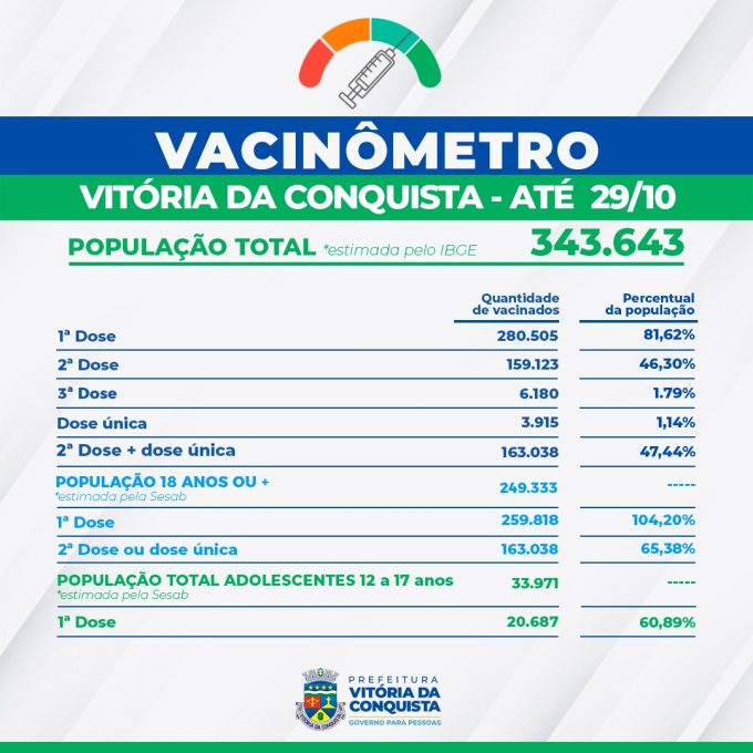 Com atualização dos dados da vacinação até esta sexta-feira (29), a Secretaria Municipal de Saúde (SMS) alcançou 280.505 conquistenses vacinados com a 1ª dose da vacina contra a Covid-19, equivalente a 81,62% da população do município, com base na estimativa do IBGE/2021. Com a 2ª dose ou dose única são 163.038 pessoas imunizadas, correspondendo a 47,44% da população geral.