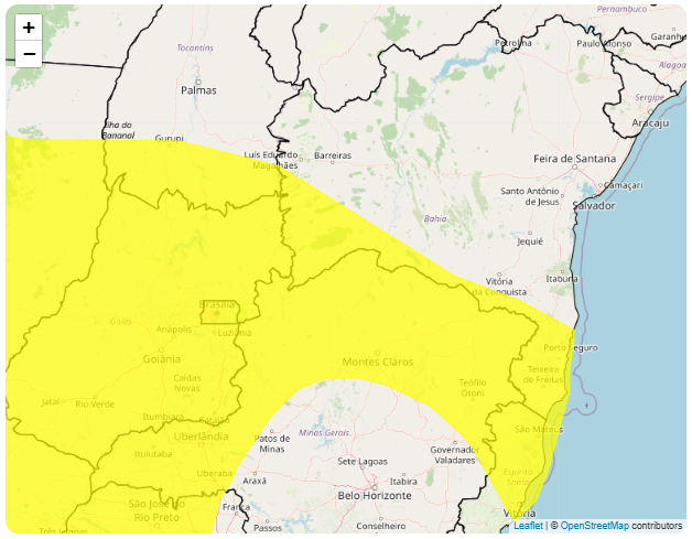 Presente em uma grande faixa do interior do país, o alerta compreende as regiões Sudoeste e Sul da Bahia, incluindo parte do território de Vitória da Conquista. Segundo o aviso do Inmet, há baixo risco de corte de energia elétrica, queda de galhos de árvores, alagamentos e descargas elétricas.