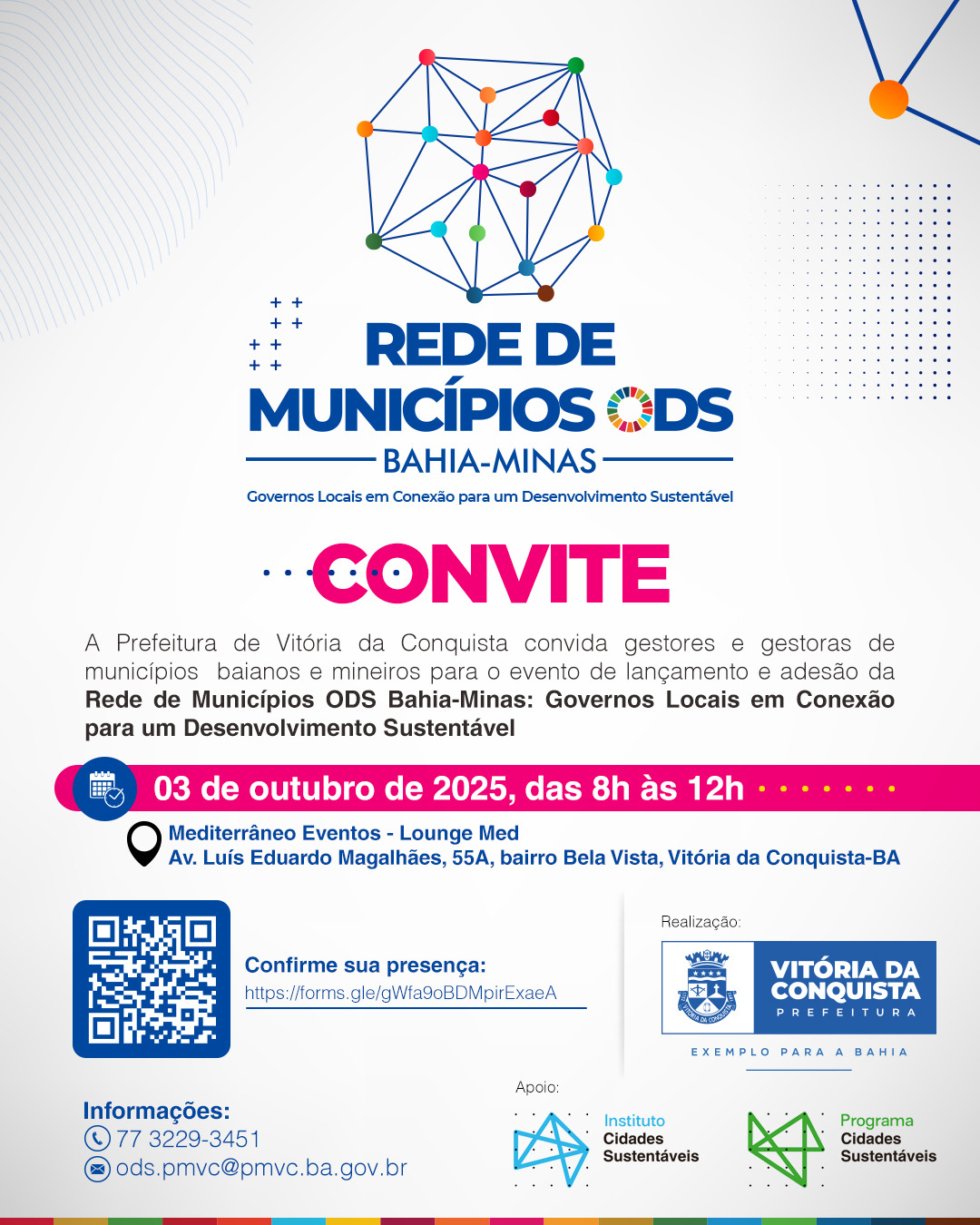 A Prefeitura de Vitória da Conquista realiza nesta sexta-feira (3), o lançamento e adesão da Rede de Municípios ODS Bahia-Minas Gerais: Governos locais em conexão para um desenvolvimento sustentável, com a participação exclusiva de gestores municipais dos dois estados. O evento acontece no Mediterrâneo Eventos Lounge Med, das 8h às 12h.
