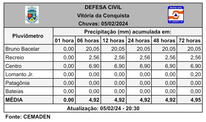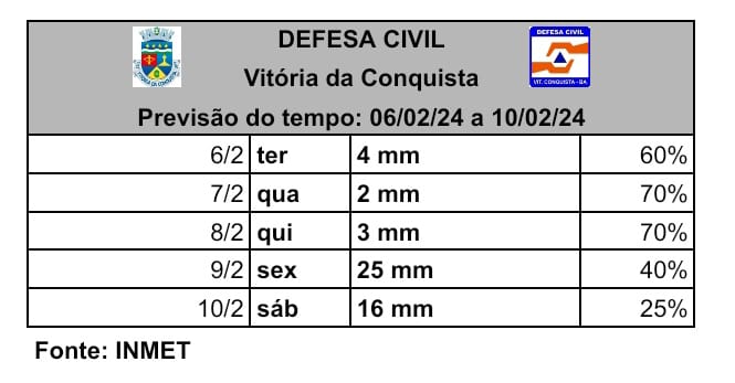 A Defesa Civil de Vitória da Conquista divulgou, na noite desta segunda-feira (5), a quantidade de chuva que caiu no município nas últimas horas e a previsão do tempo até sábado (10).