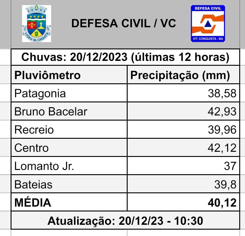 Vitória da Conquista registrou nas últimas horas uma média de 40,12 milímetros de chuva. Os dados foram obtidos por meio dos pluviômetros da Defesa Civil instalados em diferentes pontos da cidade.