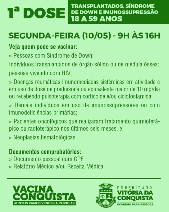 Para comprovação, os portadores de hipertensão e diabetes devem apresentar relatório médico, receita médica ou cadastro de acompanhamento da Unidade de Saúde de referência. Já os trabalhadores da Educação devem apresentar o contracheque de abril de 2021. As pessoas transplantadas, com síndrome de Down e imunossupressão, com idade entre 18 e 59 anos, devem levar o relatório médico e/ou receita médica. Todos os públicos incluídos na vacinação devem apresentar o documento pessoal com CPF.