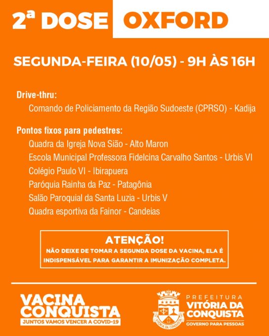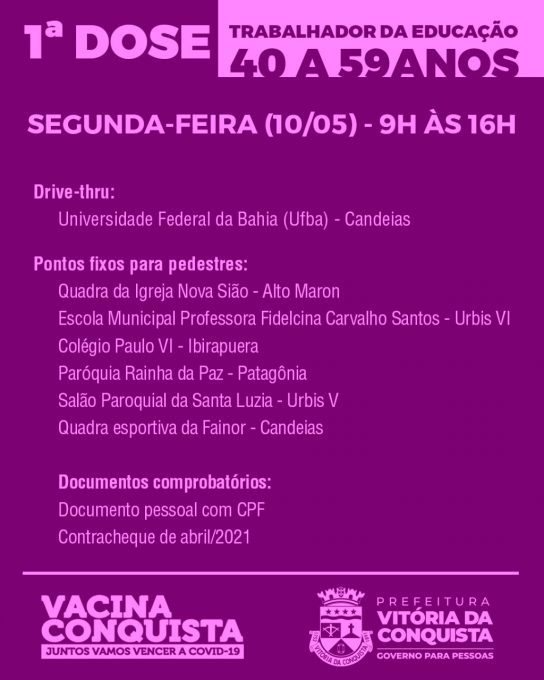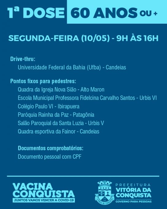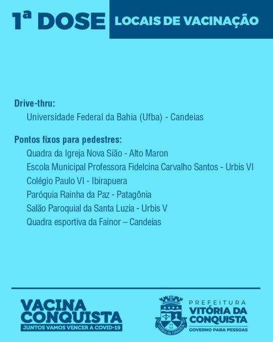 A vacinação desses grupos continua nesta segunda-feira (10), das 9 às 16 horas. A população pode se dirigir a um dos pontos fixos para pedestres, localizados na quadra da Igreja Nova Sião, Escola Municipal Professora Fidelcina Carvalho Santos, Colégio Paulo VI, Paróquia Rainha da Paz, Salão Paroquial da Santa Luzia e quadra esportiva da Fainor; ou no drive-thru na Universidade Federal da Bahia (Ufba).