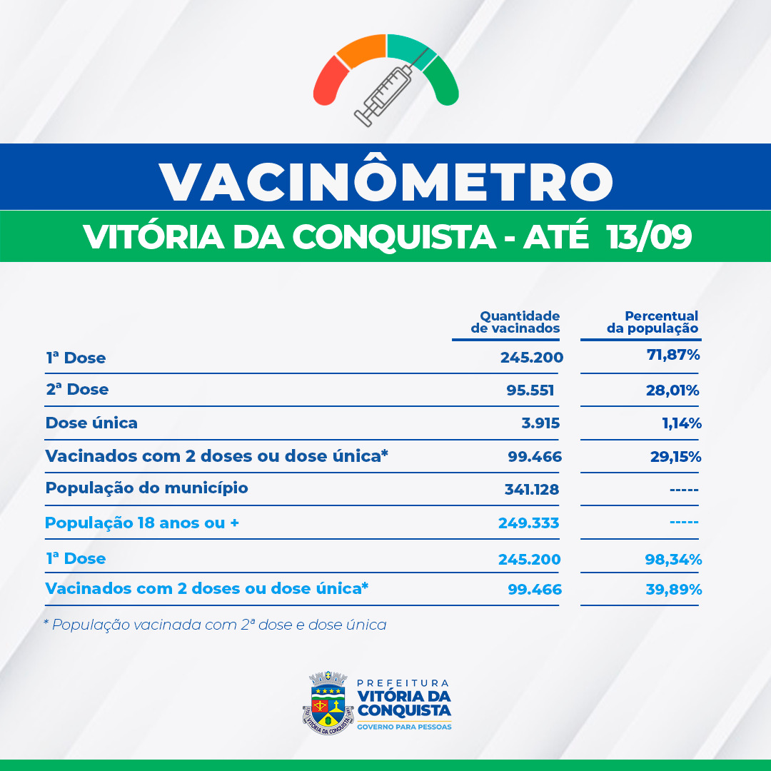 Até ontem (13), 245.200 conquistenses já tinham sido vacinados com a 1ª dose da vacina contra a Covid-19. O número é equivalente a 71,87% da população do município estimada pelo IBGE (2020). Quando é considerada apenas a população maior de 18 anos, segundo as estimativas da Secretaria de Saúde do Estado da Bahia (Sesab), o percentual chega a 98,34%.