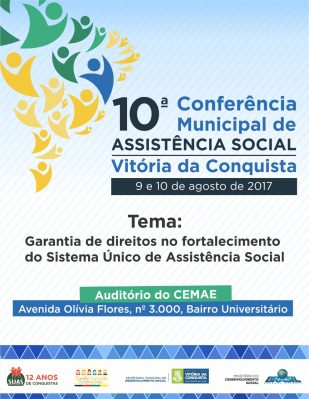 Nos dias 9 e 10 de agosto, no auditório do Cemae, acontece a X Conferência Municipal de Assistência Social de Vitória da Conquista, que este ano traz como tema “Garantia de direitos no fortalecimento do SUAS“. O evento é uma das etapas da XI Conferência Nacional de Assistência Social, que acontece no período de 5 a 8 de dezembro, em Brasília.